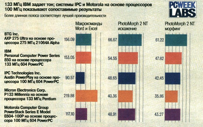 В тестах PhotoMorph PowerPC оказался между высокоскоростной системой на основе Alpha и системами с Pentium. Самая медленная из систем на основе PowerPC - IPC - превзошла по производительности машину Micron (цена - $5999), одну из самых быстрых Pentium-систем из тех, что мы тестировали.