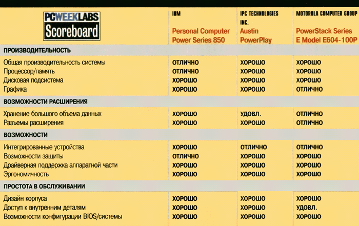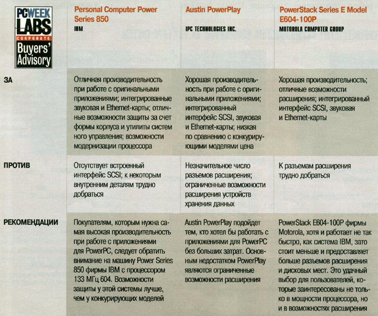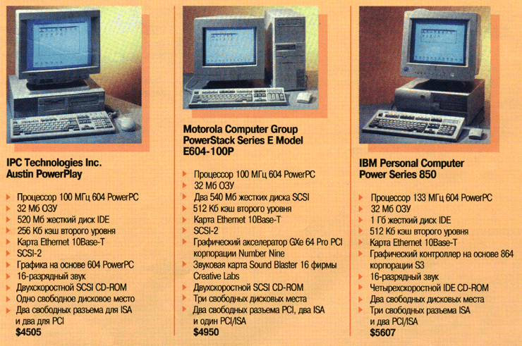 Первые PReP-совместимые (PReP - PowerPC Reference Platform) настольные системы на базе процессора 604 (Power Series 850 фирмы IBM, $5607; Austin PowerPlay фирмы IPC Technologies, $4505; PowerStack Series группы Motorola Computer Group, $4950) в тестах, проведенных центром PC Week Labs при работе с приложениями, интенсивно использующими процессор, показали производительность не ниже, а зачастую даже выше, чем системы на основе Pentium (конфигурации систем описаны в таблице).