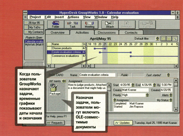 Поскольку пакет GroupWorks поддерживает OLE 2.0, в нем легко привязать к заданию документы от текстовых процессоров и электронные таблицы. С помощью принадлежащего корпорации HyperDesk расширения технологии OLE с именем Network OLE (Сетевое OLE) к документам системы GroupWorks любого пользователя могут получить доступ все остальные участники проекта.