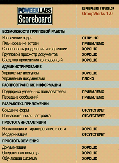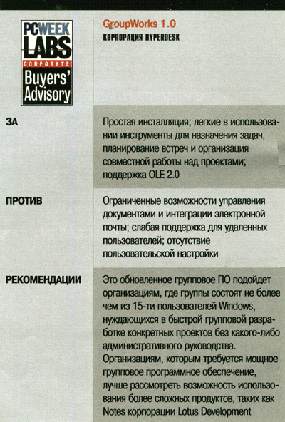Такая система в большинстве случаев хорошо работает для малых групп, но корпорации HyperDesk следует резко усилить возможности GroupWorks по управлению документами. Программе не хватает развитых средств, имеющихся в других пакетах групповых ПО, например в пакете Open Mind корпорации Attachmate.