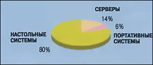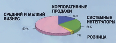Возвращаясь к основной теме прошедшей презентации, стоит отметить, что на ней впервые была обнародована статистика по объемам продаж компьютеров фирмы Dell в России. (Сам по себе это весьма знаменательный для России факт, дающий пищу для официального сравнительного анализа деятельности компьютерных фирм и свидетельствующий о все более глубокой цивилизованности рынка.) Что касается структуры продаж в России в 1994 - 1995 гг., то, по словам директора Дивизиона персональных компьютеров Азера Бадалова, в целом она соответствует мировой, разве что несколько больший (по сравнению с мировым) процент приходится на продажу серверов Dell ввиду активизации сетевого подразделения IBSn несколько меньший - на портативные ПК из-за низкой покупательной способности населения.