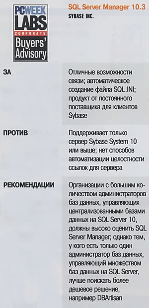 Лаборатория PC Week Labs провела тестирование выпущенной в январе программы SSM (SQL Server Manager) 10.3 фирмы Sybase и обнаружила, что она незаменима при создании связей в базах данных. Впрочем, при создании продукта авторы совершенно пренебрегли некоторыми возможностями, например массовой загрузкой данных (bulk data loading).