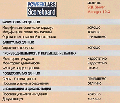 | Методика тестирования Лаборатория PC WeekLabs провела тестирование программы SQLServer Manager 10.3 фирмы Sybase, подключив ее к большому количеству тестовых баз данных. Мы также проверили, насколько полезны утилиты SSM, используя их для создания новых баз данных, таблиц и колонок. Мы установили SSM на машину DECpc 466D2LP корпорации Digital Equipment с процессором 486DX2 66 МГц, 16 Мб ОЗУ и жестким диском объемом 234 Мб, работающую под Windows 3.1 корпорации Microsoft и MS-DOS 6.2. В качестве сервера баз данных мы использовали SQL Server 10 фирмы Sybase, установленный на машине ProLiant 4000 корпорации Compaq Computer с процессором Pentium 66 МГц, работающей под управлением NetWare 3.12 фирмы Novell. |