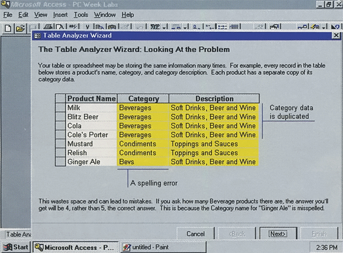 Мы использовали много новых возможностей Access 95, в том числе фильтры данных, которые можно задавать выбором из списка или заданием значений, и Мастера баз данных (Database Wizard). Однако новый Мастер анализа таблиц (Table Analyzer Wizard), который мы использовали для анализа неструктурированных файлов и последующего построения реляционной базы, все-таки требует знаний, которыми пользователи не обладают.