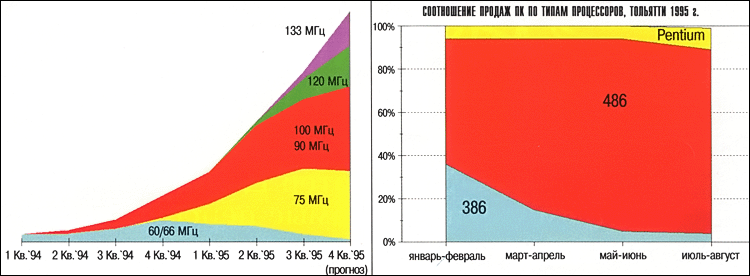 Дело в том, что на периферии популярность Pentium-машин еще не так велика. Экономящие каждый "бакс" отечественные пользователи никак не могут осознать необходимость перехода на новую элементную базу и по-прежнему требуют от реселлеров 486-е машины, хотя цена последних почти сравнялась с ценами компьютеров, выполненных на базе процессоров Pentium.