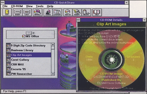 ПО CD-QuickShare - дебют на рынке CD-ROM компании из Сан-Диего, специализирующейся на сетях, ПО переписывает файлы с CD-ROM на жесткие диски сервера и компрессирует и создает библиотеки, позволяя многим сетевым пользователям иметь к ним разделяемый доступ.