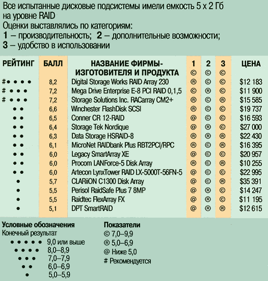 Из рассмотренных дисковых массивов по крайней мере три - StorageWorks RAID Array 230 (Digital), RACa-ray CM2+ (SSI), RAIDION LT X 6.3 (Micropolis) -ожидаются на российском рынке. Заметим, что из пяти первых RAID-систем три используют контроллеры Mylex. Все RAID-массивы тестировались в конфигурации RAID 5. Как известно, именно этот уровень RAID позволяет достигнуть оптимального соотношения стоимости и производительности системы.