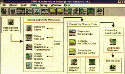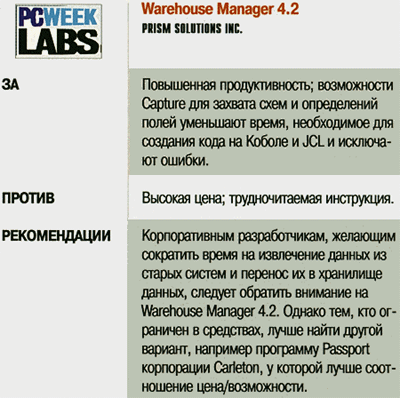 Корпоративным разработчикам, которые ищут методы, ускоряющие извлечение данных из старых систем и перенесение их в хранилище данных, следует обратить внимание на пакет Warehouse Manager 4.2 фирмы Prism Solutions. Программа автоматизирует утомительный процесс создания и поддержки кода на Коболе и jcl и увеличивает продуктивность разработок.