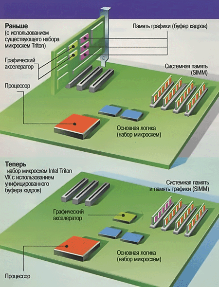 Как сообщают, набор микросхем Triton VX сделает ненужным использование микросхем видеопамяти, поскольку в нем реализована "Унифицированная архитектура памяти", которая резервирует для графики 1-2 Мб системной памяти.