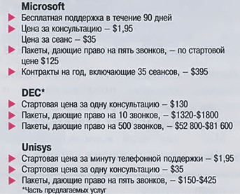 Например, DEC оценивает поддержку Windows 95 в $130 за одну консультацию. Эта компания предлагает за $20 000 также специальный пакет услуг, помогающий переводу ста пользователей на Windows 95 и обеспечивающий им необходимую поддержку. Корпорация Unisys предлагает поддержку Windows 95 по стартовым ценам $35 за консультацию или $1,95 за минуту телефонного разговора.