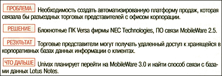 Сейчас вместо того чтобы идти на встречу с клиентами с ручкой и блокнотом в руках, торговые представители Univax имеют в своем распоряжении самую свежую и полную информацию о клиентах в памяти их блокнотных ПК. По словам Досмена, при помощи сотовых модема и телефона они могут связаться с штаб-квартирой и получить доступ к любым дополнительным данным. Лэрри Лайнэм, менеджер по регионам фирмы Univax, сказал, что положительным следствием новой политики в отношении разъездных сотрудников стало то, что у них высвободилось много времени. "Это не только сократило количество бумаг, которые мне приходится носить с собой, - мне теперь легче работать вместе с сотрудниками над одним проектом, когда все мы находимся вне спроса", - сказал он.