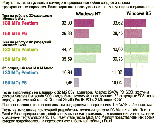 В тестах, проведенных тестовыми центрами PC Week и PC Magazine, 150 МГц процессор P6, который выйдет этой осенью, значительно превзошел в производительности 133 МГц Pentium только при работе с 32-разрядными приложениями под 32-разрядной ОС. В эталонном тесте Winstone 95, в котором используются 16-разрядные приложения под Windows 3.1, P6 работал не намного быстрее 133 МГц Pentium.