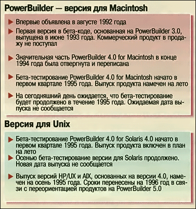 В начале нынешнего года представители Powersoft заявили о намерении весной завершить бета-тестирование PowerBuilder для Macintosh и Solaris и летом приступить к его выпуску. Больше корпорация не называет никаких сроков.