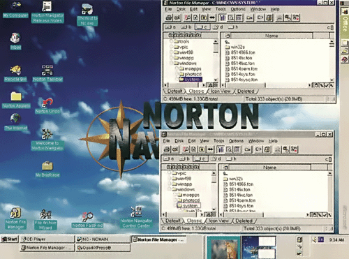 Итак, чем же помогает в работе Norton Navigator? Давайте по порядку. Norton File Manager. Ну точь-в-точь старый добрый Explorer, только с добавками. Поддержка сжатых ZIP-файлов (прозрачно, вплоть до использования интерфейса drag and drop), шифрование файлов и еще больше десятка мелочей. Честно скажу - я как не пользовался программой Windows 95 Explorer, так не пользуюсь и Norton File Manager, но для любителей будет весьма приятно.