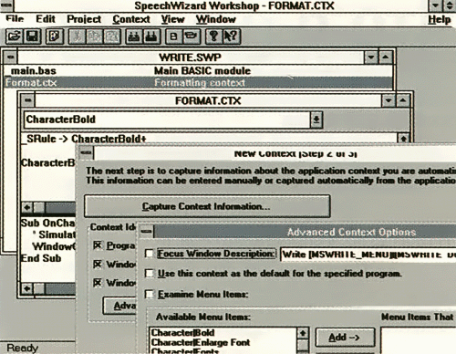 SpeechWizard Workshop очень похож на другие средства автоматизации приложений, входящие во многие продукты корпорации Microsoft. На экране появлялись указания, советующие нам загрузить Windows-приложение, в котором мы хотели бы работать с применением голосовых команд, а затем мы использовали специальную комбинацию кнопок, чтобы захватить контекст этого приложения из памяти.