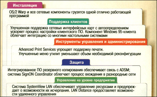 Многие из компонентов, составляющих OS/2 Warp Server, на самом деле не новы. В основе лежат OS/2 и WARP LAN Server 4.0. На следующем уровне находятся система удаленного доступа, которая обеспечивается опциями управления LAN Distance и SystemView, частично заимствованными из NetFinity, распределение программ через NetView DM/2 и связь с NetWare, в которой используется собственная система запросов к OS/2 фирмы Novell.