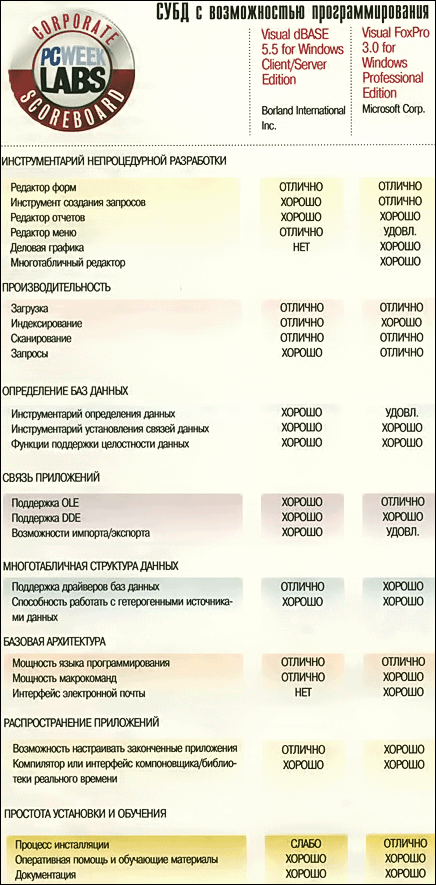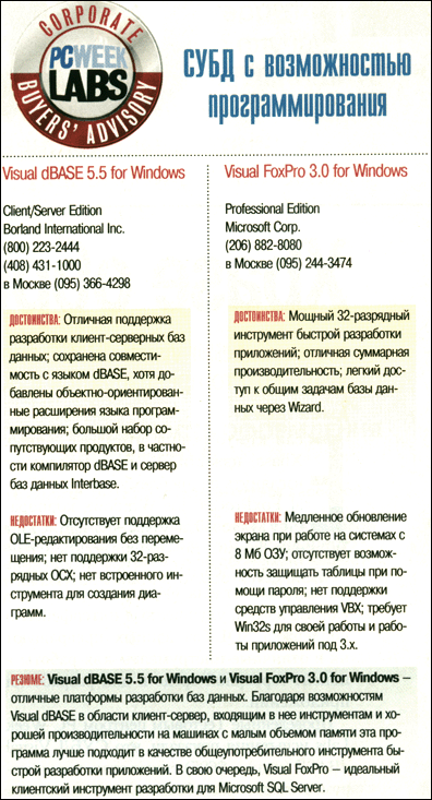 Если кто-то решил, что базы данных Xbase изжили себя, ему следует взглянуть на проблему еще раз. Visual FoxPro 3.0 for Windows корпорации Microsoft и Visual dBASE 5.5 for Windows фирмы Borland International не просто полномасштабные СУБД для работы на уровне отдела. Объектно-ориентированные языки, улучшенные интерфейсы и поддержка SQL-баз данных превращают их в отличные инструменты для работы в клиент-серверной среде и для разработки приложений.