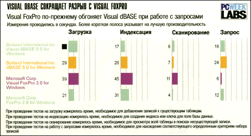 В тестах, которые раньше проводил Тестовый центр PC Week Labs, производительность FoxPro всегда оказывалась самой высокой. Даже учитывая большое количество новых возможностей, включенных в последнюю версию, показанные Visual FoxPro результаты удивили нас. В целом, производительность Visual FoxPro составила до 15% от производительности FoxPro 2.6 for Windows, самой быстрой из протестированных СУБД.
