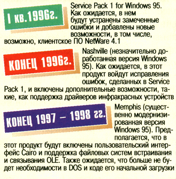 Корпорация Microsoft (Редмонд, шт. Вашингтон) приняла решение о переносе срока выпуска первого сервисного пакета для Windows 95 с этой осени на начало 1996 года и уклоняется от объявления даты представления первой полной версии данного продукта, получившей условное название Nashville.