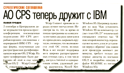 Пример такого отношения подает корпорация IBM. На мою статью "АО CPS теперь дружит с IBM" (PC Week/ RE, №11/95, с. 51) российское представительство корпорации в лице Николая Смирнова незамедлительно откликнулось четырехстраничным письмом, переданным по факсу. Письмо оказалось очень интересным, и не опубликовать основные его положения просто невозможно.