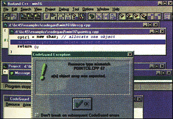 Выпущенная в конце прошлого месяца по цене $99,95 (после 30 ноября цена составит $149,95) система CodeGuard представляет собой набор альтернативных библиотек для 16-разрядных приложений, работающих под Windows 3.x, Windows 95 или Windows NT. Компоновка программы с библиотеками CodeGuard, дает возможность расширенной диагностики при работе в интегрированной среде разработки фирмы Borland, и при автономном выполнении приложения.