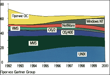 Что бы там ни говорили, популярность Windows NT растет. Кроме того, все большим успехом начинает пользоваться появившееся в прошлом году семейство серверных приложений Microsoft BackOffice, включающее в себя 5 компонентов: сетевую операционную систему MS Windows NT Server 3.51, сервер управления базами данных MS SQL Server 6.0, сервер связи с SNA сетями MS SNA Server 2.1, сервер управления системой MS Systems Management Server и почтовый сервер MS Mail Server, на смену которому в скором времени придет информационный сервер MS Exchange Server.
