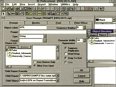 Чтобы создать отчет, мы "подтаскивали" объекты, например колонки таблиц, из каталога объектов, который установили через систему Knowledge Base Editor, и помещали их в область деталей нашего отчета. Двойной щелчок на объекте вызывал диалоговое окно, позволявшее нам определять и форматировать этот объект, в том числе запрещать дублирование и задавать условия печати.