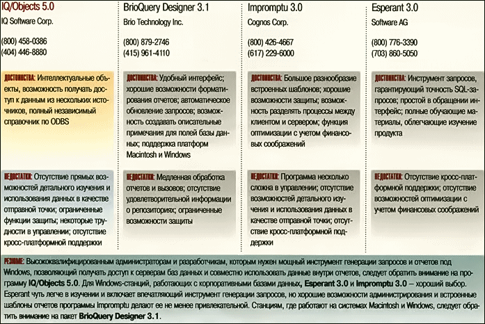 Возможности генерации запросов и отчетов программы IQ/Objects оказались вполне хороши, хотя в ней и отсутствуют черты типа SQL Expert программы Esperant, которая гарантирует точность SQL-запросов. Как и в случае с Impromptu, управлять программой IQ/Objects было довольно трудно.