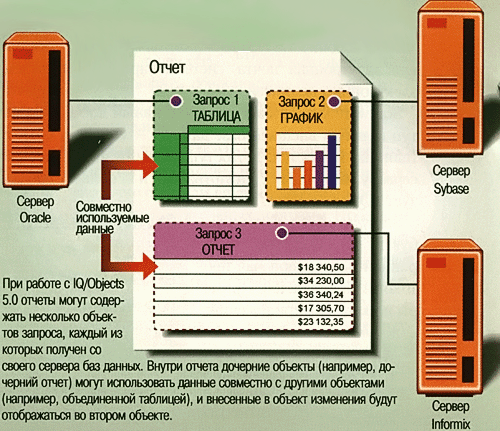 IQ/Objects - шаг вперед по сравнению с основанными на фреймах инструментами генерации отчетов типа Impromptu 3.0 корпорации Cognos, поскольку он задействует интеллектуальные объекты, позволяя разработчикам создавать большое количество сложных отчетов о запросах к разнородным базам данных.