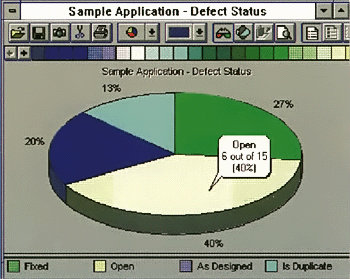 StarTeam предлагает дополнительные визуальные средства поддержки в виде диаграмм для многих атрибутов проектов, в том числе для типа и количества несоответствий между разными версиями файлов. Мы смогли исследовать статус дефектов файла при помощи круговых и распределение длин файлов при помощи столбиковых диаграмм, что тут же позволило обнаружить любые модули, которые разрослись до неконтролируемого размера.