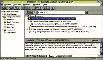 Остальные группы функций: Topics, обеспечивающая проведение электронных конференций (см. экран), и Audit, отслеживающая во все время разработки проекта изменения в состоянии и классификацию любого дефекта.