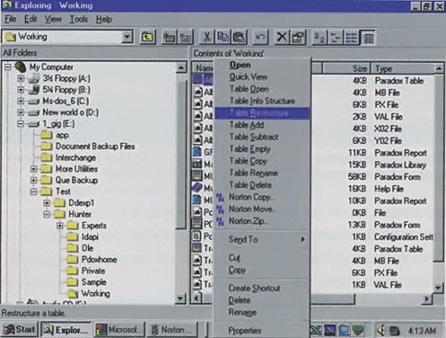 Например, если щелкнуть правой кнопкой мыши на таблице из Explorer, то появляются опции Paradox для этой таблицы. После этого можно изменять структуру, уничтожать или вносить добавления в любую таблицу, щелкнув на соответствующей опции.