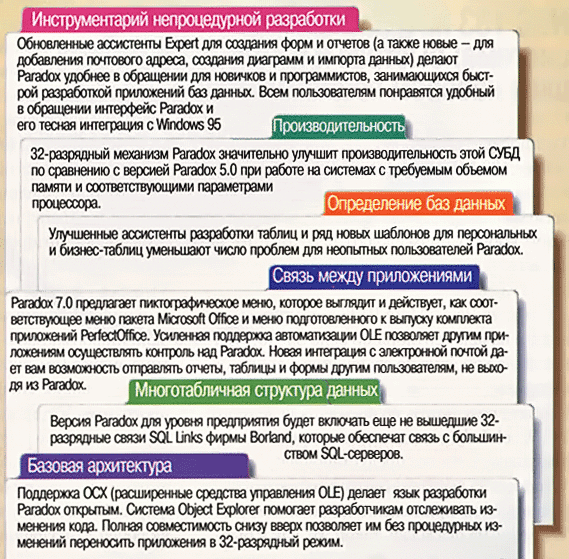 Достоинства предыдущих версий Paradox состояли в его среде разработки, и в версии 7.0 эти функции стали еще более мощными. Например, Paradox 7.0 поддерживает 32-разрядные расширенные средства управления OLE, что позволяет разработчикам интегрировать в свои Paradox-приложения компоненты от других производителей.