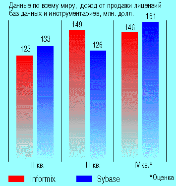 “Если по результатам четвертого квартала 1995 г. рост доходов Sybase будет по-прежнему составлять около 20% годовых, а Informix - 55%, то они могут поменяться местами”, - сказал Дэн Кузнецкий, руководитель исследований, проводимых корпорацией International Data по программе Unix and Server Operating Environments Program.