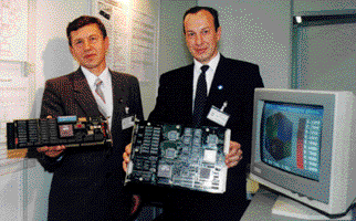 В рамках этих работ в 1993 г. на основе микропроцессора i860XR-40 разработан вычислительный модуль - акселератор МП-0 для ПЭВМ типа PC AT с шиной ISA. Конструктивно он реализован в виде двухплатной конструкции. На одной плате находятся микропроцессор, оперативная память, системный контроллер и блок интерфейса с адаптером, а на другой - реализован собственно адаптер интерфейса с шиной ISA. Плата вычислителя имеет пиковую производительность 120 MIPS (80 MFLOPS при одинарной точности), содержит 8/16 Мб ОЗУ и работает на частоте 40 МГц. Платы соединены при помощи гибкого соединителя. Такое техническое решение позволяет разрабатывать платы адаптеров под различные типы системных шин, сохраняя вычислительную часть, и более гибко приспосабливаться к потребностям пользователей. Программное обеспечение позволяет модулю функционировать в средах DOS, OS/2 и Unix. При тестировании на различных научных задачах он показал производительность, сравнимую с производительностью систем на Pentium-66. Эти модули-акселераторы эксплуатируются в настоящее время в различных научных учреждениях: ВНИИЭФ, ВНИИТФ и др.