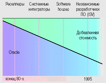 Если говорить о мировой стратегии Oracle, то главные изменения могут быть проиллюстрированы приведенным ниже графиком, характеризующим сдвиг в сторону уменьшения доли Oracle в общей стоимости конечного продукта, т. е. корпорация позиционирует себя не как поставщик конечных решений, а как поставщик фундамента для них. Для привлечения разработчиков корпорация реализует во всем мире мощную программу Business Alliance Program, о ней (PC Week/RE, 15/95, с. 50) уже писали .