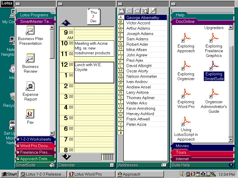 Заново спроектированный командный центр (показанный здесь) Windows 95-версии пакета SmartSuite корпорации Lotus Development значительно упрощает использование комплекта офисных приложений, в том числе 32-разрядных версий Approach, Word Pro и Freelance Graphics, входящих в пакет. Включенная в комплект электронная таблица 1-2-3 также была усовершенствована, но все еще остается 16-разрядным приложением. Особый интерес для рабочих групп представляют компоненты TeamMail и TeamReview пакета SmartSuite. Они являются наиболее мощными инструментальными средствами для групповой работы среди тех, какие когда-либо тестировались в PC Week Labs. Полный обзор пакета SmartSuite будет опубликован в одном из ближайших выпусков еженедельника.