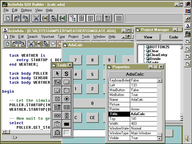 Ни Personal, ни Professional не создают thread-safe-кода. Это возможно в пакете ActivAda NT ($995), выпущенном в сентябре вместе с менее дорогими изданиями, но в данном обзоре он не рассматривается. Как и Professional Edition, Personal Edition генерирует Win32-приложения, которые могут работать под Windows 3.1 с расширениями Win32s или напрямую - под Windows 95 и Windows NT.