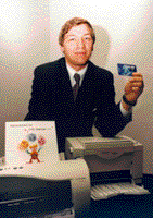 Сергей Шахов демонстрирует новые струйные принтеры Lexmark и персональную пластиковую карточку, которую получат их покупатели