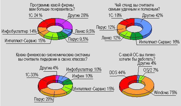 В течение всей выставки фирмой “Бизнес - Программы - Сервис” и Ассоциацией разработчиков экономических программ (АРЭП) среди посетителей проводился опрос, результаты которого нам любезно предоставил директор фирмы Николай Комлев. Некоторые из них, касающиеся представленных на выставке программных продуктов, мы приводим на диаграммах. (Общее число обработанных анкет - 182.)