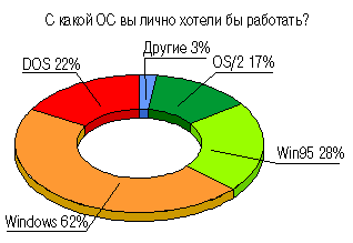 Эти цифры показывают, что большинство пользователей-бухгалтеров сегодня уже ориентировано на работу в Windows, однако доля предпочитающих работать в DOS еще очень велика - более половины от первой группы. Любители OS/2 составляют пока незначительный процент.