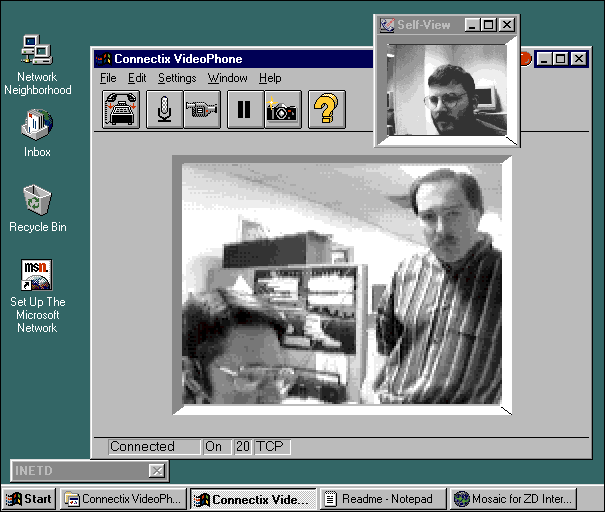 Хотя, разумеется, видео, которым мы обменивались по Internet, было не столь четким, как в системах с выделенной комнатой и выделенной линией ISDN, работающей со скоростью 384 Кбит/с, его вполне хватало для простых изображений людей и предметов (см. рисунок).