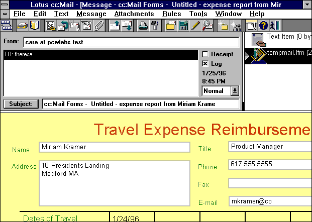 В cc:Mail 6.0 встроена технология Forms корпорации Lotus. Мы смогли получить доступ к cc:Mail Forms Filler (заполнитель форм) из подменю инструментов cc:Mail и заполнить форму отчета по расходам - один из нескольких шаблонов форм, которые, вероятно, будут поставляться с релизом 6.0. Мы также смогли просмотреть эти формы и ввести данные, не покидая cc:Mail. Представители Lotus сказали, что средство создания форм появится в продаже, когда начнутся поставки cc:Mail 6.0.