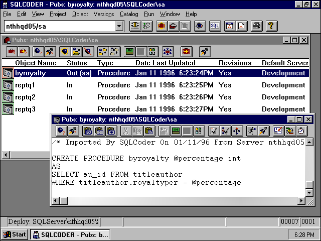 С помощью SQL Coder мы управляли репозиторием исходных кодов для объектов баз данных, которые мы хранили и делили на категории по проектам на нашем Microsoft SQL Server 6.0. После инсталляции версии 1.6.3 на рабочей станции под Windows 95 мы создавали и редактировали объекты репозитория и затем включали их в каталог SQL Server.