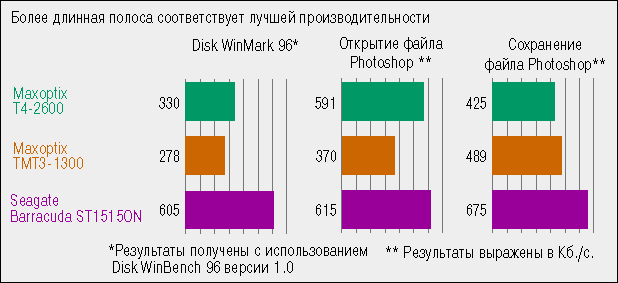 Разница между скоростью чтения и записи стала очевидной, когда мы открыли файл размером 20,7 Мб в программе Photoshop фирмы Adobe System. Накопитель T4-2600 работал примерно на 60% быстрее, чем TMT3-1300, и почти с той же скоростью, что и наш жесткий диск - Barracuda ST15150N фирмы Seagate Technology с интерфейсом SCSI.