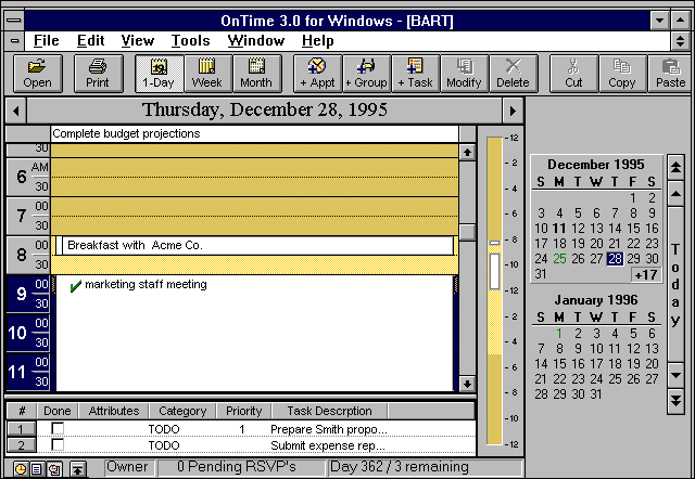 Поле в виде ежедневника является обычным элементом для таких конкурирующих продуктов, как TimeVision и Schedule+, где на верхнюю панель вынесена информация о назначенных встречах; внизу располагается список предстоящих дел, а список текущего, предыдущих и последующих месяцев расположен справа. Мы легко переделали расположение этих компонентов экрана, изменили длину строки, отведенную для записи запланированных мероприятий, и внесли другие изменения.