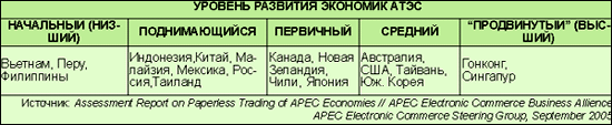 Обзор состояния дел в странах АТЭС по безбумажной торговле, приуроченный к упомянутому выше симпозиуму стран АТЭС по этой теме, отразил не только различные ее формы, но и состояние инфраструктуры, юридический базис, политику в области ее поддержки, уровень стандартизации, а также практическое применение и показал, что она развивается вполне успешно, однако достигнутый уровень этого развития значительно различается в различных экономиках (см. таблицу).