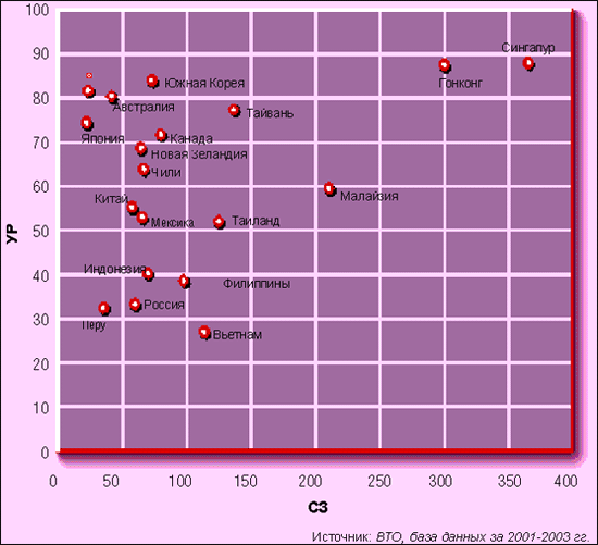 Весьма интересной является взаимосвязь уровня развития безбумажной торговли, который мы только что обсудили выше, и степени зависимости национальной экономики от торговли с зарубежными странами*1 (см. рисунок). Хорошо видно, что экономики с самой большой зависимостью от внешней торговли (Гонконг и Сингапур) имеют и высший уровень развития э-торговли. Высокий уровень в США определяется тем, что там огромный внутренний рынок, существенно превышающий внешний. Россия же реализует непрерывную монотоварную поставку на внешний рынок по трубопроводам газа и нефти, которая совмещена с параллельным "бумажным" потоком таможенной документации без остановки торговли. Торговля дискретными товарами, конечно, в наибольшей степени требует электронной поддержки для ее непрерывности.