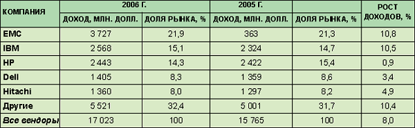 Пять крупнейших производителей внешних дисковых систем по итогам 2006 г. (по данным IDC)