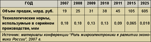 В итоге объем продаж изделий отечественной электроники на внутреннем и внешнем рынках должен будет стремительно расти, а технологические нормы - плавно уменьшаться (см. таблицу).